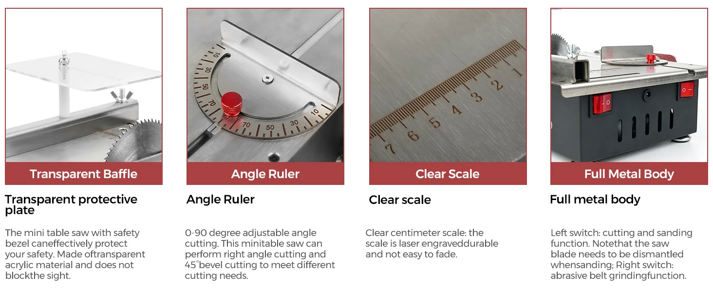 【PORTABLE AND CONVENIENT】This mini table saw measures 10 x 11.5 x 4 inches, weighs 11 pounds, and has a cutting depth of 30 mm. It comes with a clear safety baffle that won't block your view and allows for 90° right-angle cuts and 45° miter cuts. Side belt sander for sharpening knives, other metal tools, etc.