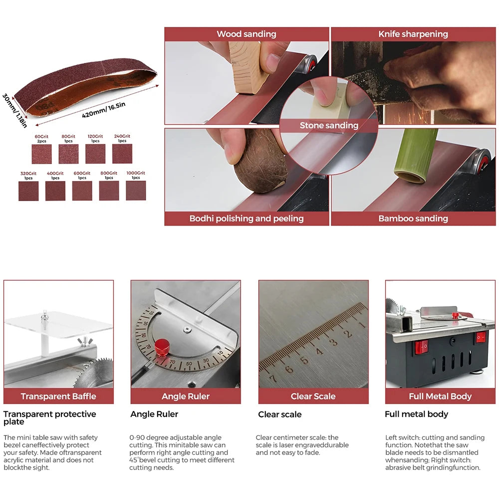 【HIGH QUALITY MULTIFUNCTIONAL TABLE SAW】Mini multifunctional table saw is made of high quality metal, which is not only easy to rust and wear-resistant, has a long service life. The base is stable and sturdy, it can be placed on the table. The sharp saw teeth and uniform sanding belt offers high quality.