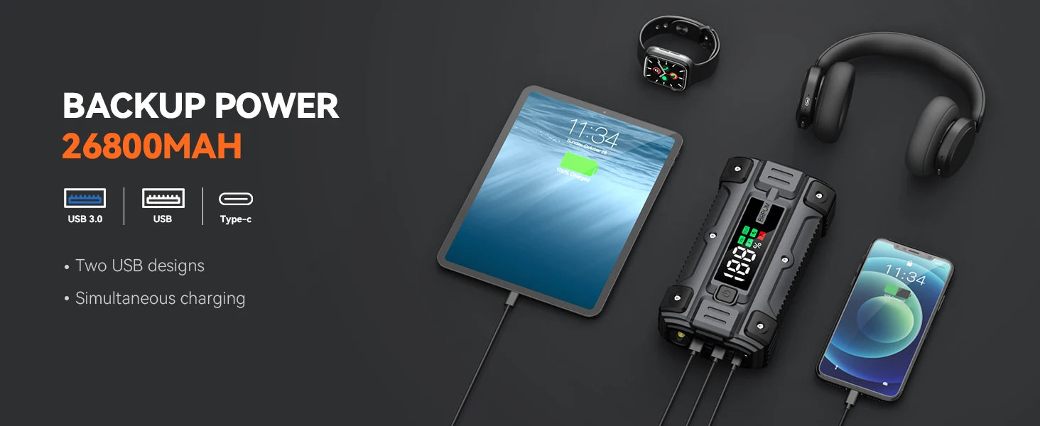 26800 mAh power bank: 2 intelligent USB outputs (including 18 W fast charging port: QC3.0 USB output & 5 V/2.4 A USB output) on the car battery are suitable for laptops, phones or other small devices, so you can easily charge them on the go. (To extend the life of the product, please charge it every three months, even when not in use. This applies to all electronic products).