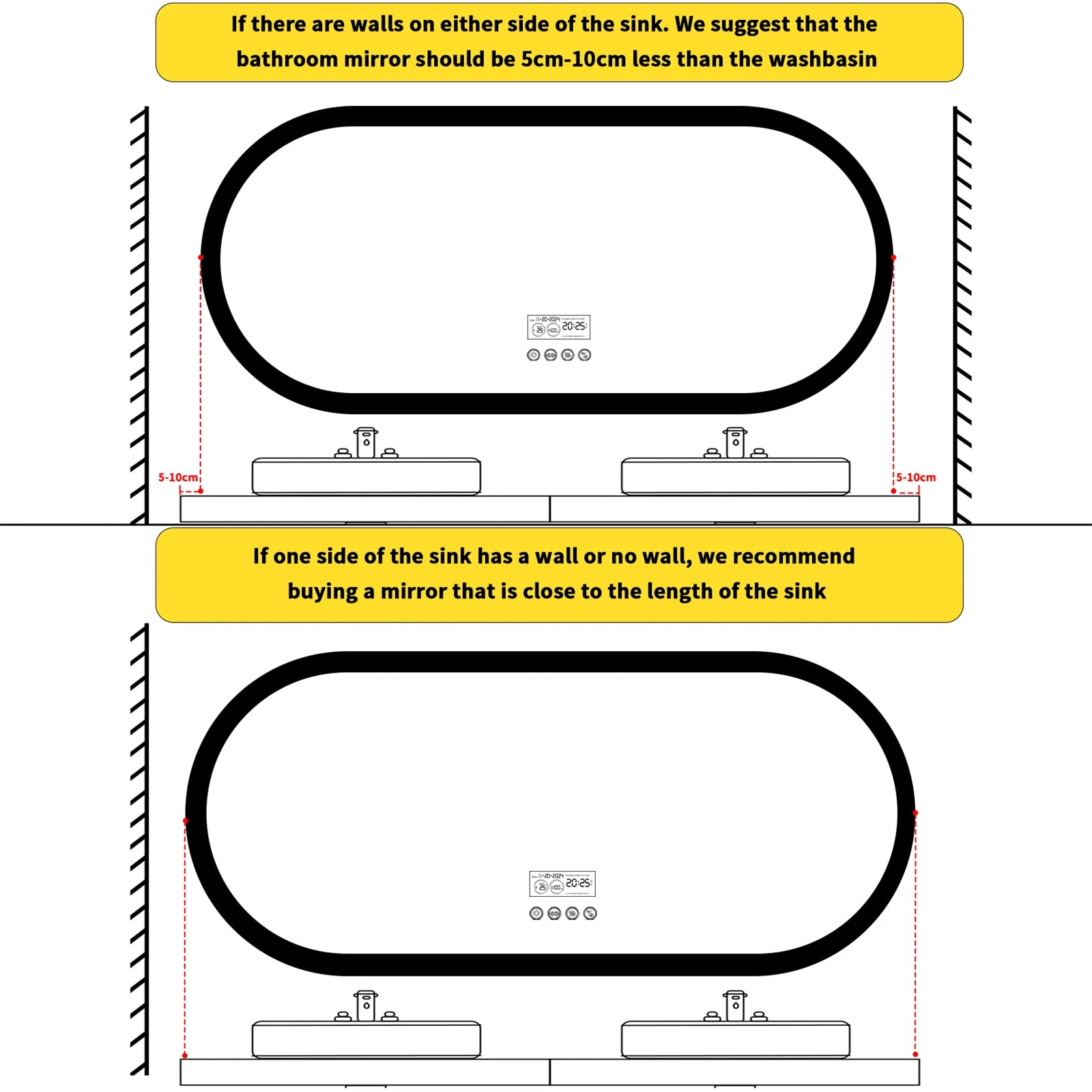 Large Bathroom Mirror Oval LED Vanity Mirror Wall Mounted w Bluetooth, Digital Display, Back Front Lit, Anti Fog for Hotel Hall